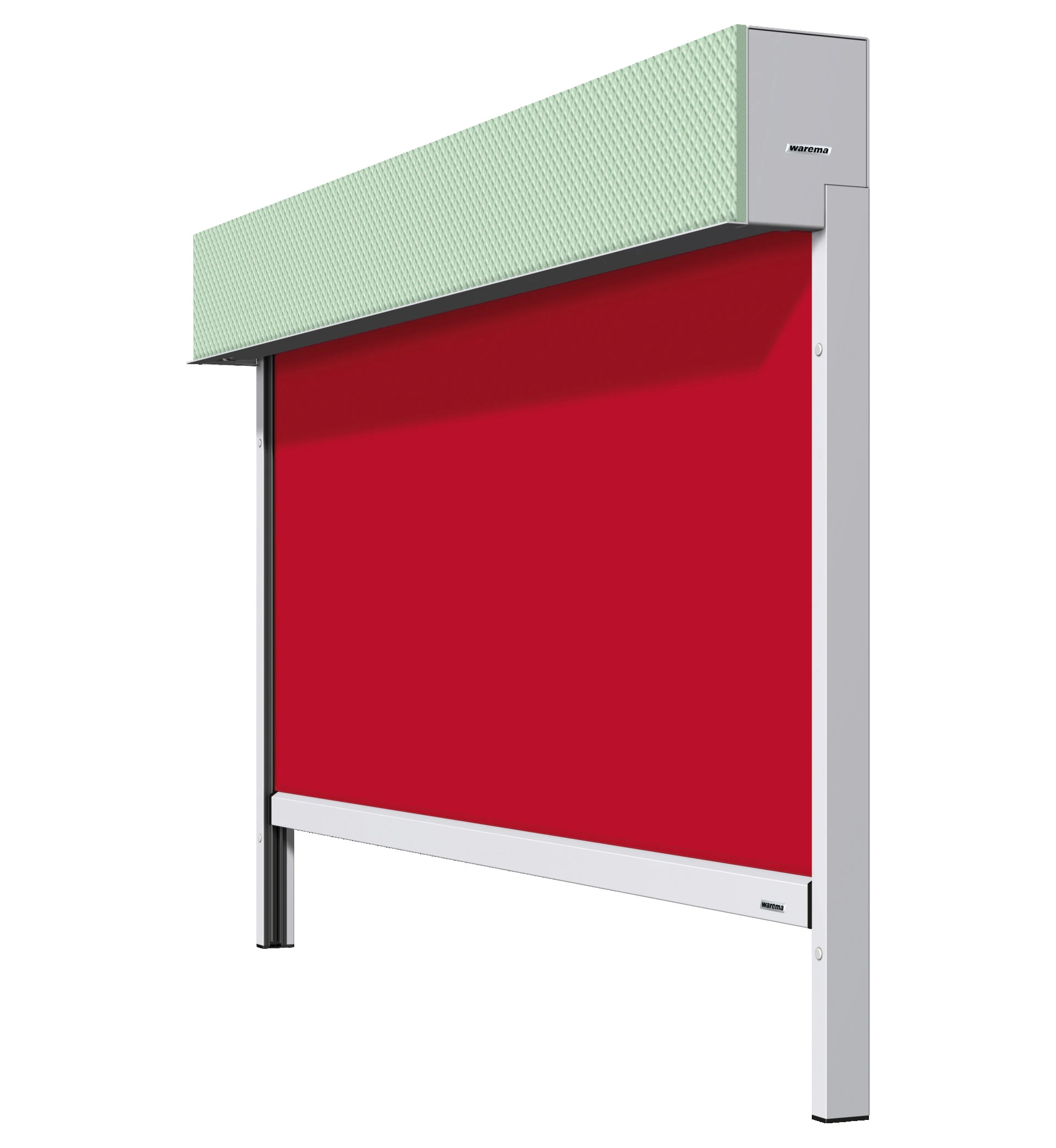 Markise in Rot mit grünem verputzbaren Kasten und Schienenführung